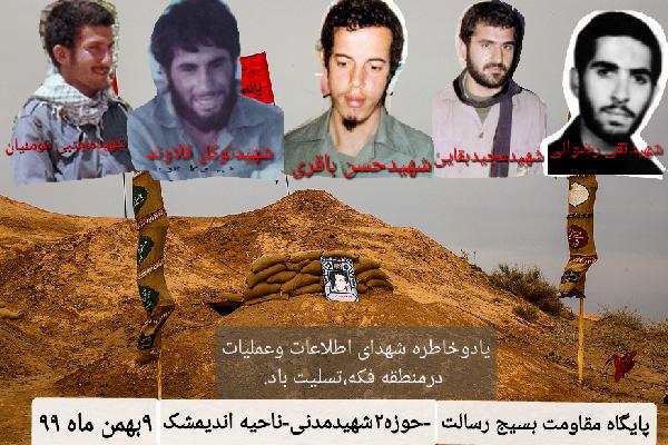 پوستر شهدای اطلاعات توسط پایگاه بسیج رسالت مسجدامام حسن عسگری(ع)اندیمشک در۹بهمن۹۹ ساخته شد. این پوستر درمورد شهدای اطلاعات و عملیات شهیدان باقری وقلاوند و بقایی و رضوانی و مومنیان که در منطقه فکه در۶۱/۱۱/۹ به شهادت رسیدند.