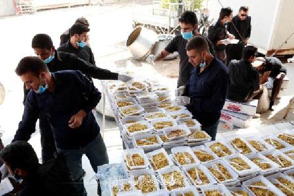 کادر خدماتی مسجد کوفه سه وعده غذا میان زائران توزیع می کند و برای آنان آب نوشیدنی فراهم می کند.