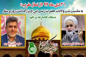 ۱۸ دی ۱۳۹۷ - ۱۶:۵۹ ۲۱ دیماه برگزار میشود؛ جشن میلاد حضرت زینب(س) در مسجد جامع غدیر خم مسجد جامع غدیر خم به مناسبت گرامیداشت سالروز میلاد اسوه صبر و استقامت حضرت زینب کبری(س) و روز پرستار مراسم جشن برگزار میکند.