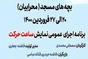 مختاری گفت: نمایش «ساعت حرکت» به مناست هفته هنر انقلاب اسلامی در راستای طرح تئاتر بچه های مسجد به میزبانی حوزه هنری و با همکاری اعضای کانون فرهنگی هنری «۱۸ اسفند» در مسجد حضرت صاحب الزمان (عج) جونقان اجرا می شود.