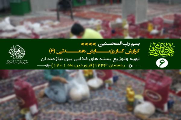 مسئول کانون فرهنگی هنری قائم (عج) با اشاره به اینکه ششمین رزمایش همدلی با هدف کمک به نیازمندان برگزار شده است، افزود: همزمان با ماه مبارک رمضان 80 بسته معیشتی، بهداشتی و غذایی تهیه و در بین خانواده های نیازمند توزیع شد.
