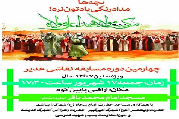 چهارمین دوره مسابقه نقاشی غدیر با همکاری مسجد حضرت امام سجاد(علیه السلام) شهرک زیباشهر، مسجد حضرت ولیعصر(عج)، مسجد حضرت زهرا(سلام الله علیها) شهرک اندیشه و حوزه مقاومت بسیج شهید قدوسی زنجان برگزار می شود.