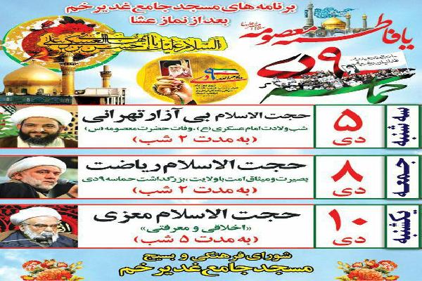 با حضور سه سخنران مطرح کشوری ویژه برنامههای میلاد امام حسن عسکری(ع)، وفات حضرت معصومه(س) و بزرگداشت یوم الله ۹ دی در مسجد غدیر خم برگزار میشود.