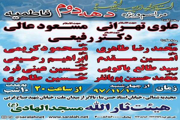 هیئت ثارالله مسجد الهادی (ع) مراسم ویژه دهه دوم فاطمیه برگزار میکند.