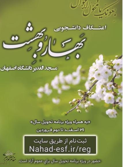 شناسه خبر: 8985 ۲۹ اسفند ۱۳۹۷ - ۱۲:۵۸ خبرنگار: به همراه ویژه برنامه تحویل سال؛ مراسم اعتکاف دانشجویی با عنوان «بهار و بهشت» از امشب در مسجد الغدیر دانشگاه اصفهان برگزار میشود. به گزارش پایگاه خبری مسجدنیوز،مراسم اعتکاف دانشجویی با عنوان «بهار و بهشت» در مسجد الغدیر دانشگاه اصفهان برگزار میشود.این مراسم از ۲۹ اسفند تا ۲ فروردین ماه ۹۸ به همراه ویژه برنامه تحویل سال برگزار میشود. منبع: دانشجو N8985/U27/S1,/C4/T2